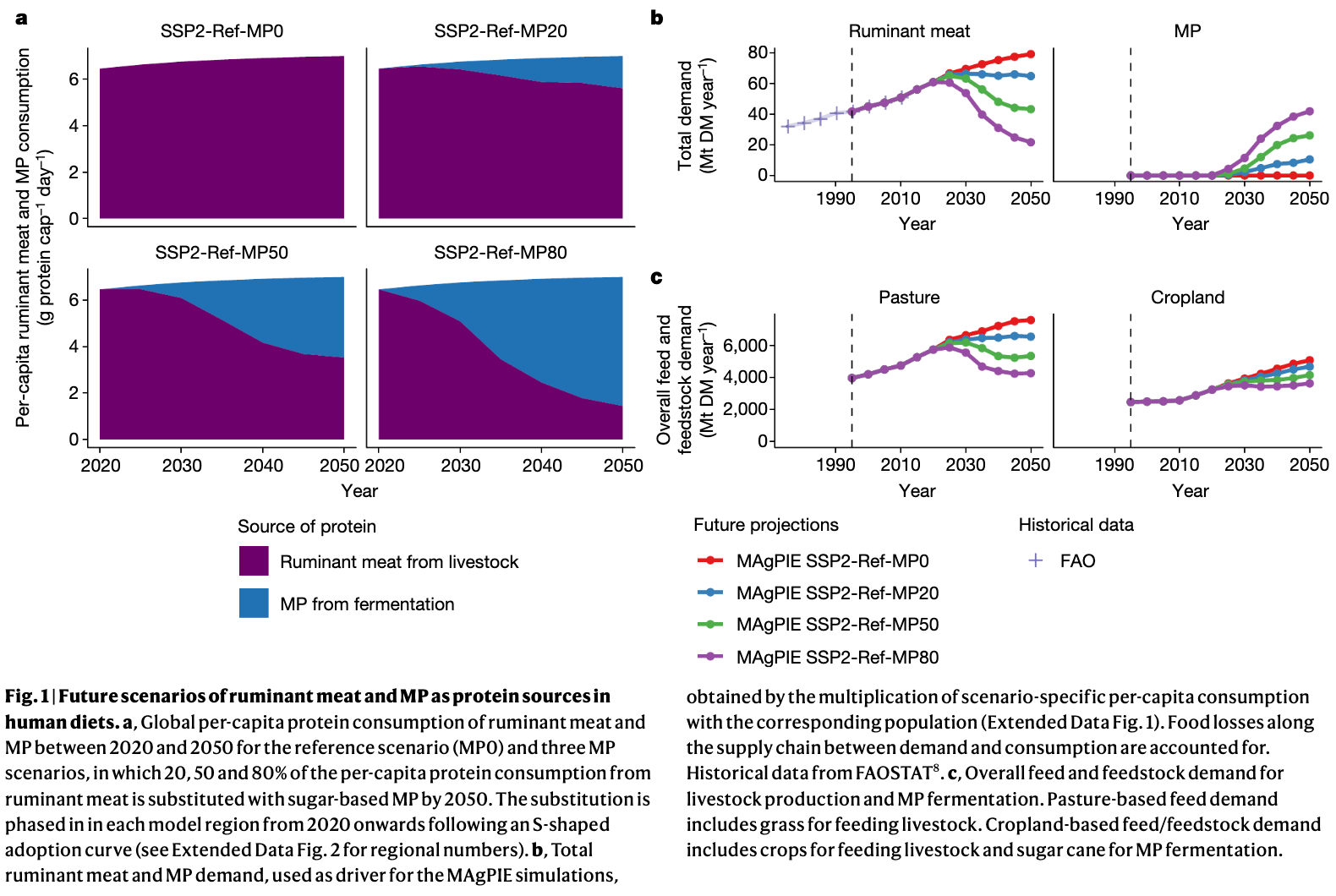 Our model projections show that substituting 20% of per-capita ruminant meat consumption with MP globally by 2050 (on a protein basis) offsets future increases in global pasture area, cutting annual deforestation and related CO2 emissions roughly in half, while also lowering methane emissions.